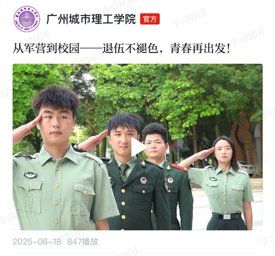 “2025年度高校人氣作品”是“學(xué)習(xí)強國”平臺從2025年同學(xué)匯上線的7萬多件作品中精選出200件作品,根據(jù)作品質(zhì)量、傳播效果、大眾投票等評選出的120件作品。廣州城市理工學(xué)院獲獎作品由黨委宣傳部學(xué)生傳媒中心團隊(汽車與交通工程學(xué)院2024級趙禧萌;國際商學(xué)院2023級潘怡曉;電子信息工程學(xué)院/通信工程學(xué)院2024級賴瑩;管理學(xué)院2024級梁苑桐、李思達)拍攝制作。作品用意象與轉(zhuǎn)場,定格廣州城理學(xué)子從軍營到校園的蛻變,通過便裝到戎裝的卡點轉(zhuǎn)換,展現(xiàn)青年學(xué)子成長為“戰(zhàn)士”的動人歷程。軍裝細(xì)節(jié)與“海棠花未眠”的意象交織,詮釋了軍人朝朝堅守、默默盛開的品格。這不僅是一次身份的轉(zhuǎn)變,更是一場精神儀式,致敬每一位將青春獻給祖國的廣州城理人,也彰顯他們退伍不褪色、歸來續(xù)芳華的精神風(fēng)貌。