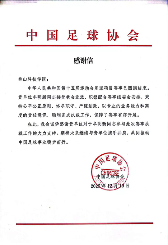 近日,泰山科技學(xué)院收到中國足球協(xié)會發(fā)來的感謝信,協(xié)會對學(xué)校在中華人民共和國第十五屆運(yùn)動會足球項目賽事中所提供的鼎力支持表示衷心感謝,并對學(xué)校教師牟明新在執(zhí)裁工作中展現(xiàn)出的專業(yè)能力、公平公正原則和高度責(zé)任感給予充分肯定。