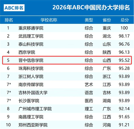 近日,ABC排名發(fā)布2026年中國民辦大學排名,晉中信息學院憑借卓越的辦學實力、鮮明的育人特色與持續(xù)提升的社會聲譽,位列全國第五,且連續(xù)三年穩(wěn)居山西省同類院校首位(2024-2026年)。