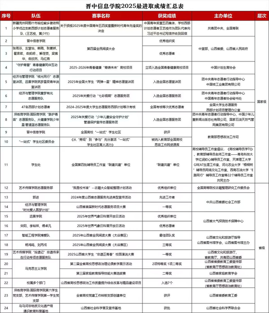 2025年,晉中信息學院育人工作實現(xiàn)了從深耕省內(nèi)到引領(lǐng)全國的標志性跨越,在平臺建設(shè)、品牌項目與青年引領(lǐng)方面取得系統(tǒng)性成果,以多項國家級榮譽與突破性數(shù)據(jù),彰顯了“最進取”品牌的硬核實力。