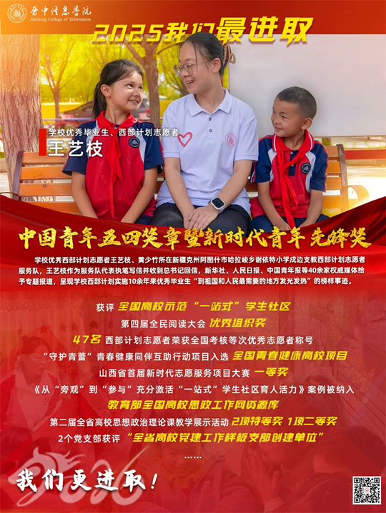 問鼎國家級青年最高榮譽:學校西部計劃志愿者王藝枝所在的新疆克州阿圖什市戍邊支教西部計劃志愿者服務(wù)隊,榮獲“2025年度中國青年五四獎?wù)录w”。作為服務(wù)隊致信習近平總書記的執(zhí)筆人,這份榮譽不僅是對信院學子奉獻精神的最高褒獎,更是學校長期堅持“為黨育人、為國育才”導向的生動寫照。晉中信息學院十二年來已派出961名像王藝枝一樣的志愿者奔赴西部,在祖國邊疆書寫新時代青年的擔當。正如人民日報·經(jīng)緯線專題片所展現(xiàn)的,王藝枝和她的隊友們繼續(xù)在帕米爾高原上書寫著青春答卷。他們用行動證明:青春最美的姿態(tài),是用自己的雙手和愛心,把腳下這片土地耕耘成能夠照亮他人前行道路的燈塔,讓青春之花綻放在這片需要愛與知識的土地上。