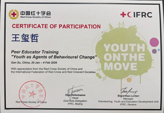 在為期6天的沉浸式學(xué)習(xí)中,王璽哲同學(xué)與來(lái)自全國(guó)各地的青年精英圍繞紅十字運(yùn)動(dòng)七項(xiàng)基本原則、社會(huì)性別平等、跨文化對(duì)話等議題深入研討,通過(guò)“家庭沖突模擬”“情景劇創(chuàng)排”等實(shí)操課程,系統(tǒng)掌握了同伴教育的方法論工具包,為后續(xù)開(kāi)展校園人道教育積累了寶貴經(jīng)驗(yàn)。