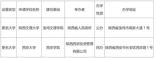 根據(jù)《中華人民共和國(guó)高等教育法》《普通高等學(xué)校設(shè)置暫行條例》《普通本科學(xué)校設(shè)置暫行規(guī)定》等有關(guān)規(guī)定,經(jīng)陜西省高等學(xué)校設(shè)置評(píng)議委員會(huì)考察和評(píng)議,現(xiàn)對(duì)擬向教育部申報(bào)的“寶雞文理學(xué)院更名陜西文理大學(xué)”“西京學(xué)院更名西京大學(xué)”事項(xiàng)予以公示,接受社會(huì)監(jiān)督。