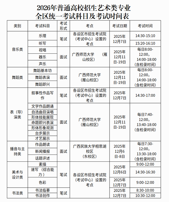 2026年普通高校招生藝術(shù)類(lèi)專(zhuān)業(yè)全區(qū)統(tǒng)一考試(以下簡(jiǎn)稱(chēng)全區(qū)藝術(shù)統(tǒng)考),設(shè)置音樂(lè)類(lèi)、舞蹈類(lèi)、表(導(dǎo))演類(lèi)、播音與主持類(lèi)、美術(shù)與設(shè)計(jì)類(lèi)、書(shū)法類(lèi)、戲曲類(lèi)等7個(gè)考試類(lèi)別,其中戲曲類(lèi)采用省際聯(lián)考由相應(yīng)專(zhuān)業(yè)(劇種)的組考院校負(fù)責(zé)組織(另文公布),其余考試類(lèi)別由我院組織,具體安排如下表:
