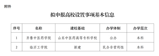| 山東省擬設(shè)置齊魯中醫(yī)藥學(xué)院、臨沂工學(xué)院 |