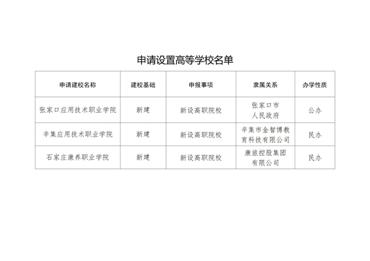 根據(jù)《中華人民共和國高等教育法》《高等職業(yè)學(xué)校設(shè)置標(biāo)準(zhǔn)(暫行)》等有關(guān)規(guī)定,經(jīng)河北省高等學(xué)校設(shè)置評議委員會專家考察和評議,新設(shè)張家口應(yīng)用技術(shù)職業(yè)學(xué)院、辛集應(yīng)用技術(shù)職業(yè)學(xué)院、石家莊康養(yǎng)職業(yè)學(xué)院事項(xiàng)獲得通過,現(xiàn)將學(xué)校名單向社會公示。