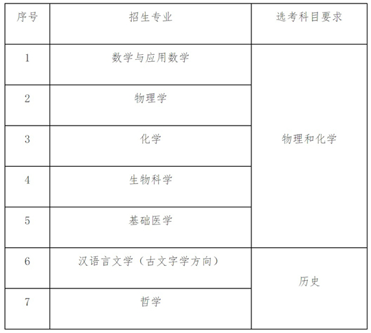 為突出基礎(chǔ)學(xué)科在國家關(guān)鍵領(lǐng)域的支撐引領(lǐng)作用,同時聚焦國家人才緊缺的人文社會科學(xué)領(lǐng)域,我校強基計劃招生專業(yè)設(shè)置如下:數(shù)學(xué)與應(yīng)用數(shù)學(xué)、物理學(xué)、化學(xué)、生物科學(xué)、基礎(chǔ)醫(yī)學(xué)、漢語言文學(xué)(古文字學(xué)方向)﹑哲學(xué),具體分省分專業(yè)招生計劃以報名系統(tǒng)內(nèi)公布為準。
