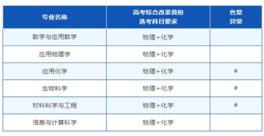 2.對(duì)考生身體健康狀況的要求執(zhí)行教育部、原衛(wèi)生部、中國殘疾人聯(lián)合會(huì)制定并下發(fā)的《普通高等學(xué)校招生體檢工作指導(dǎo)意見》中的規(guī)定。標(biāo)記“#”的專業(yè)不招收相關(guān)色覺異常(色盲、色弱、單色不能識(shí)別)考生。