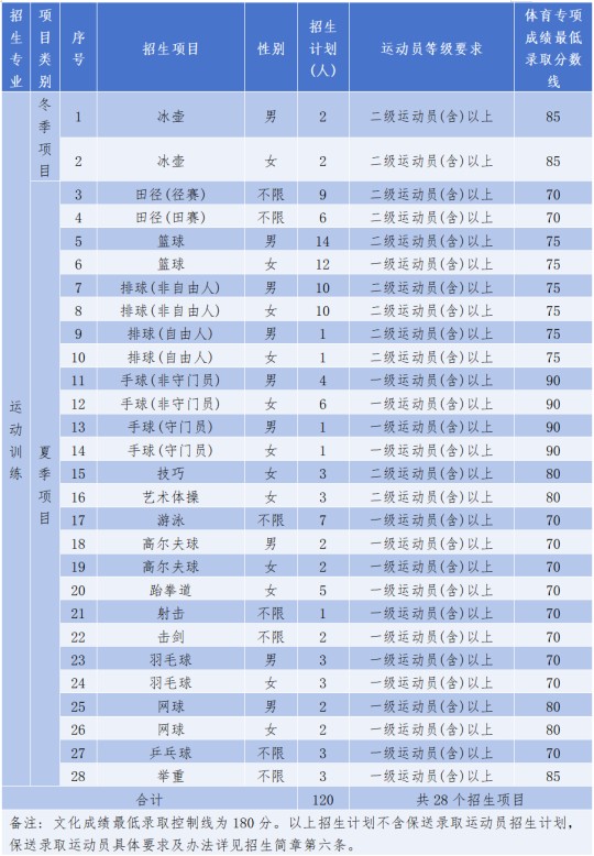 。2)體育專項(xiàng)成績(jī)最低錄取控制線:手球項(xiàng)目90分;冰壺、舉重項(xiàng)目85分;技巧、藝術(shù)體操、網(wǎng)球項(xiàng)目80分;籃球、排球項(xiàng)目75分;其他項(xiàng)目70分。具體見各項(xiàng)目招生計(jì)劃表。