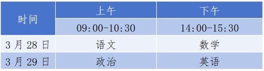考生按照準(zhǔn)考證上的考點(diǎn)信息于2026年3月28日至29日參加文化考試。文化考試時(shí)間安排如下: