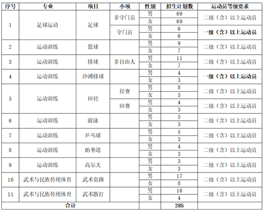 共計285個,其中運動訓練專業(yè)90個,武術與民族傳統(tǒng)體育專業(yè)45個,足球運動專業(yè)150個。具體分項目(或小項)分男女招生計劃數(shù)如下: