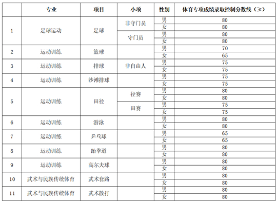 。ㄒ唬┪幕煽冧浫】刂品謹(shù)線不低于180分。對具備一級運動員技術等級稱號的考生,文化成績錄取控制分數(shù)線不低于150分;對具備運動健將技術等級稱號的考生,文化成績錄取控制分數(shù)線不低于130分。