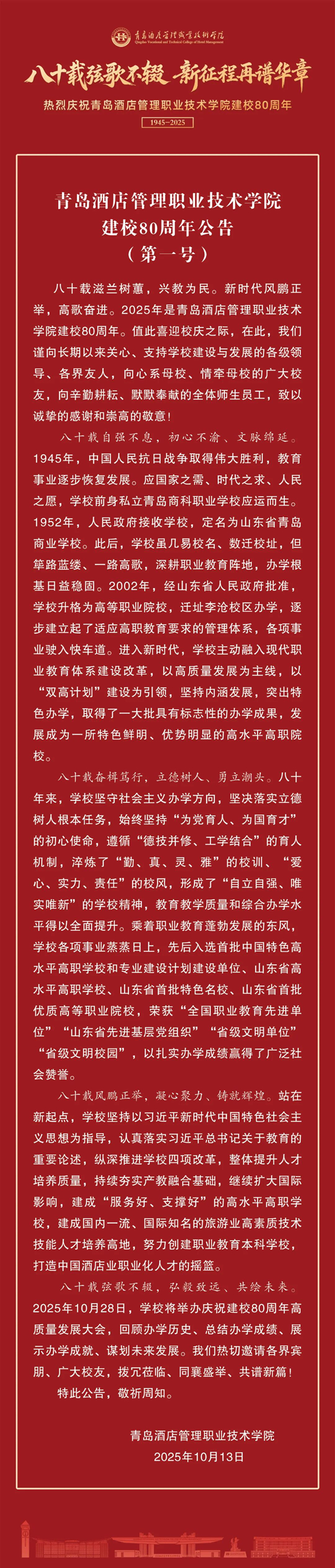 青島酒店管理職業(yè)技術(shù)學(xué)院建校80周年公告(第一號(hào))