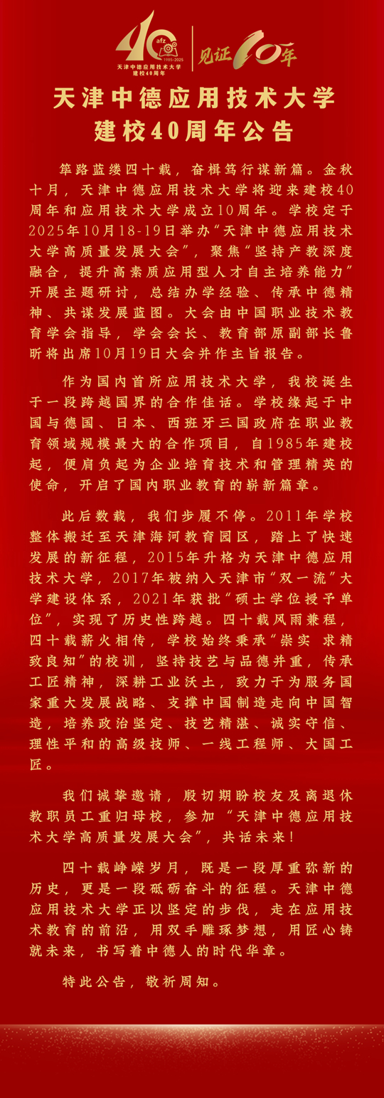 天津中德應(yīng)用技術(shù)大學(xué)建校40周年公告