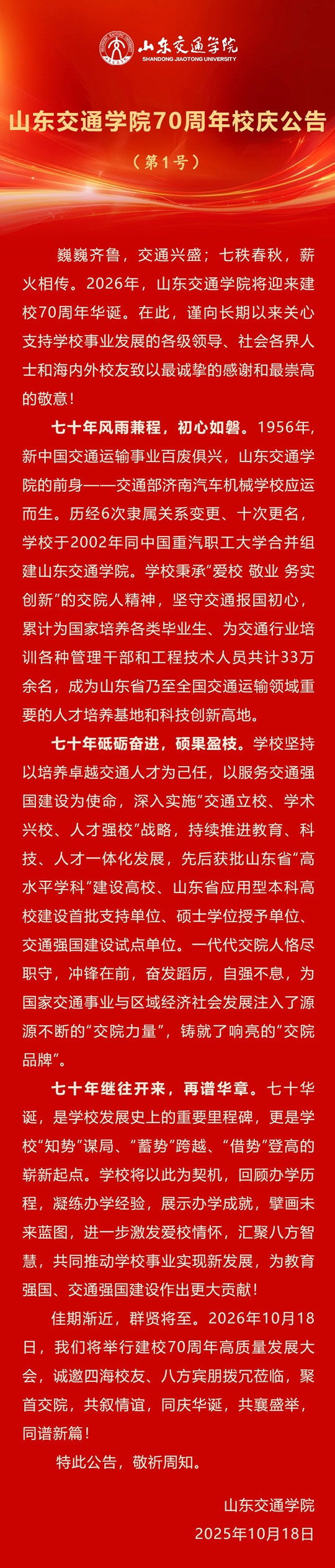 山東交通學(xué)院70周年校慶公告(第1號)