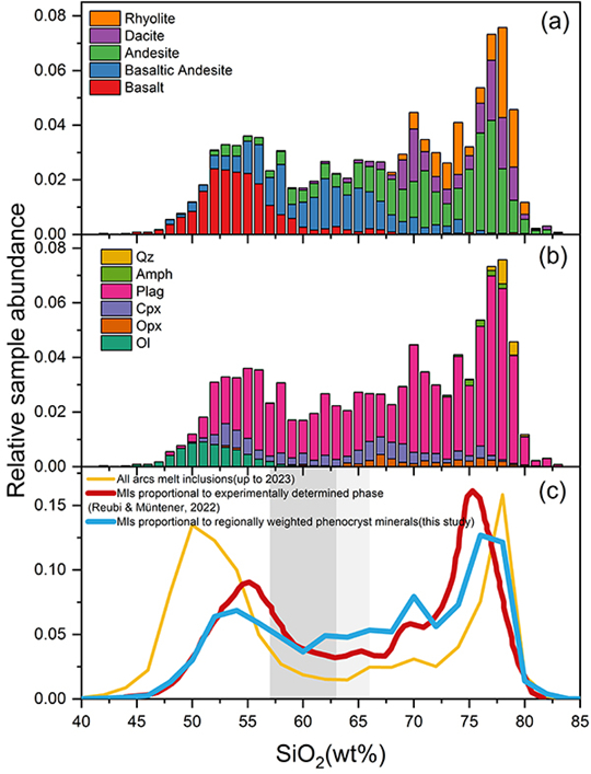 熔體包裹體是礦物在生長過程中捕獲的熔體,是研究巖漿中熔體成分演化的重要對象。以往研究表明,弧火山巖熔體包裹體SiO2含量顯示“雙峰式”分布,支持混合模型;但也有學(xué)者指出,這一雙峰式分布可能源自取樣偏差,其更支持分離結(jié)晶主導(dǎo)。為此,研究團(tuán)隊對熔體包裹體數(shù)據(jù)進(jìn)行了基于天然弧火山巖巖性比例和不同巖性火山巖中斑晶礦物比例的科學(xué)校正和系統(tǒng)分析。