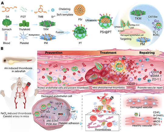 針對(duì)以上問(wèn)題,研究團(tuán)隊(duì)成功研發(fā)了一種以病理微環(huán)境驅(qū)動(dòng)為核心的納米馬達(dá)系統(tǒng)(PSr@PT NPs),該系統(tǒng)的核心由摻鍶離子(Sr2+)的介孔聚多巴胺納米顆粒(PSr NPs)構(gòu)成,它既作為納米馬達(dá)的主體,也是氧化應(yīng)激觸發(fā)下釋放Sr2+的儲(chǔ)存庫(kù),同時(shí)還能清除活性氧。為了實(shí)現(xiàn)雙重靶向推進(jìn),在PSr NPs表面整合一層由血小板膜(PM)和菠菜來(lái)源類囊體膜(TKM)組成的雜化膜;谘“迥さ陌邢蛐耘c類囊體膜的類過(guò)氧化氫酶活性,該結(jié)構(gòu)能精準(zhǔn)抵達(dá)血栓部位,并將H2O2分解為O2以驅(qū)動(dòng)納米馬達(dá)自主運(yùn)動(dòng),最終通過(guò)抑制炎癥與氧化應(yīng)激來(lái)減輕血小板-內(nèi)皮粘附。在近紅外(NIR)光照下,PSr NPs產(chǎn)生溫和的光熱效應(yīng)(約40℃),通過(guò)直接熱溶栓及增強(qiáng)納米馬達(dá)滲透實(shí)現(xiàn)雙重溶栓效果。與此同時(shí),從PSr NPs中可控的Sr2+釋放可促進(jìn)內(nèi)皮再生與屏障修復(fù),從而阻斷血栓復(fù)發(fā)的惡性循環(huán)。該納米系統(tǒng)在多種跨物種模型中均展現(xiàn)出普適性溶栓功效,包括斑馬魚(yú)花生四烯酸誘導(dǎo)的血栓模型和小鼠三氯化鐵誘導(dǎo)的頸動(dòng)脈栓塞模型。通過(guò)將植物光合膜的催化功能與哺乳動(dòng)物系統(tǒng)的靶向精準(zhǔn)性相結(jié)合,這種跨物種協(xié)同作用開(kāi)創(chuàng)了仿生納米技術(shù)的新范式。該仿生結(jié)構(gòu)將生物信號(hào)傳導(dǎo)(血小板-內(nèi)皮識(shí)別)與物理刺激響應(yīng)(光熱驅(qū)動(dòng))有機(jī)融合,從而在促進(jìn)深層血栓滲透的同時(shí)重塑微環(huán)境。這一多維度治療策略將“瞬時(shí)溶栓”升級(jí)為“可持續(xù)血管功能恢復(fù)”,為精準(zhǔn)抗血栓治療提供了一個(gè)具有轉(zhuǎn)化潛力的納米平臺(tái)。