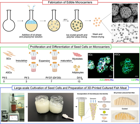 of cultured fish fillets”(利用可食性多孔微載體大規(guī)模生產(chǎn)肌肉和脂肪細胞微組織,用于3D打印培育魚肉)為題發(fā)表在國際知名期刊Nature Communications(《自然-通訊》)。薛長湖院士和鄭洪偉副教授為該論文共同通訊作者,該研究得到了國家重點研發(fā)計劃、山東省重點研發(fā)計劃等項目的支持。