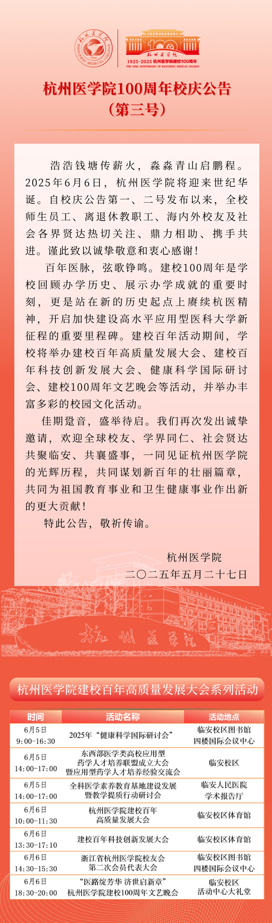 杭州醫(yī)學院100周年校慶公告(第三號)