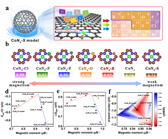 同時,針對復雜電解海水應用環(huán)境中氯離子(Cl⁻)的腐蝕問題,課題組引入磁矩描述符指導催化劑篩選與設計,利用第二配位殼層陰離子工程調(diào)控過渡金屬單原子CoN₄結構(CoN₄-X,X = B/O/F/P/S/Cl)。密度泛函理論計算表明,通過X陰離子的配位可以精確調(diào)節(jié)CoN₄中心的自旋態(tài),建立了磁矩與Cl⁻吸附能及相關催化反應中間體吸附能之間的火山型關系。位于火山曲線頂點的CoN₄-B構型催化劑顯著降低了Cl⁻吸附能,展現(xiàn)出優(yōu)異的電解海水催化活性及穩(wěn)定性。值得注意的是,該催化劑還實現(xiàn)了從-30°C至60°C寬溫區(qū)間內(nèi)的持續(xù)高效產(chǎn)氫,最大氫氣產(chǎn)率達到853 μmol/h。