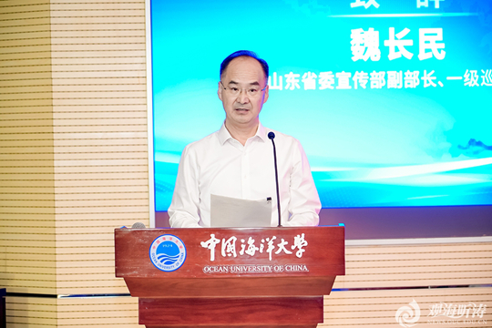 山東省委宣傳部副部長、一級巡視員魏長民,中國海洋發(fā)展基金會副理事長兼秘書長潘新春,中國海洋大學黨委副書記、校長張峻峰,中國海洋大學黨委副書記盧光志,青島市委宣傳部副部長姜劍超,東北師范大學原副校長韓東育,中山大學副校長謝湜,以及來自全國三十多所高校、科研單位的近百名專家學者出席。中國海洋大學黨委常委、副校長王厚杰主持。