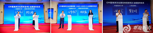 開幕式上,《中國海洋文學大系》第一輯(7卷本)發(fā)布,主編、中國海洋大學教授劉懷榮介紹了成果;《中國海洋文化百科全書》《中國海洋文化發(fā)展報告(2021-2025)》主編、中國海洋大學教授修斌,《中國海洋文化理論體系研究》主編、中國海洋大學教授曲金良分別與有關出版社代表簽署出版協(xié)議。