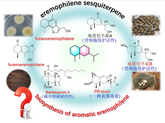 芳構化是天然產(chǎn)物生物合成中一個至關重要的過程,賦予分子獨特的化學穩(wěn)定性和生物活性。在萜類化合物中,芳構化通常涉及復雜的骨架重排,其背后的酶促機制非常獨特且鮮有研究。艾里莫酚烷(eremophilanes)是一類結構多樣、生物活性顯著的重要倍半萜類天然產(chǎn)物,具有良好的藥用開發(fā)潛力。從生物合成路徑來看,所有eremophilanes均起源于馬兜鈴烯骨架,由法尼基二磷酸(FPP)在馬兜鈴烯合酶(AS)催化下通過環(huán)化反應生成。不同于傳統(tǒng)倍半萜類化合物,eremophilanes家族中多個成員含有芳香結構,其形成涉及多異戊二烯骨架的斷裂與重排,但具體機制尚未被研究報道(圖1)。