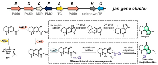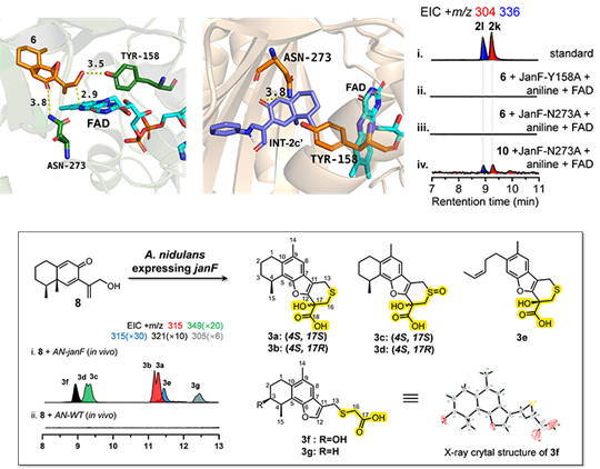研究團隊首先從一株海洋淡紫青霉Penicillium janthinellum H7-4中發(fā)掘出一個沉默的倍半萜類生物合成基因簇(jan cluster),并通過在野生菌株中過量表達該基因簇中的途徑特異性轉(zhuǎn)錄因子JanG,成功激活了該基因簇,獲得了具有芳香結構的eremophilanes類倍半萜衍生物farfugin A。為進一步解析其生物合成潛力,研究團隊將janA-F功能基因在模式菌株Aspergillus nidulans A1145中逐步異源表達,成功獲得了包括farfugin A和一類新穎的由eremophilane骨架與L-蘇氨酸雜合而成的芳香倍半萜-氨基酸加合物aza-janthinellin A。后續(xù)生物合成機制研究進一步揭示,在farfugin A與aza-janthinellin A的合成過程中均存在由(氧或氮原子)親核加成引發(fā)、并伴隨[1,2]-烷基遷移的環(huán)重排機制,最終完成芳香化的過程。尤其在aza-janthinellin A形成過程中,一個FAD依賴型單加氧酶JanF被證實能夠催化氧化烯丙醇從而生成,具有高反應活性的α,β-不飽和醛中間體,進而接受伯胺類試劑的親核攻擊,以此引發(fā)骨架的烷基化遷移和芳香化重排。研究還發(fā)現(xiàn)JanF可通過其活性口袋中的Asn273殘基穩(wěn)定C8-羰基,選擇性地引導α,β-不飽和酮發(fā)生1,2-加成而非1,4-加成,這一過程是構建芳香骨架的關鍵步驟(圖2)。在此基礎上利用JanF強大的催化功能,多種伯胺試劑與具有α,β-不飽和醇的eremophilane底物進行孵育,可以獲得結構多樣、活性良好的一系列氨基酸-eremophilane加合產(chǎn)物。