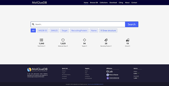 在藥物發(fā)現(xiàn)領域,分子膠降解劑(Molecular Glue Degraders, MGD)作為一種新興的靶向蛋白降解技術,正日益受到科研和制藥行業(yè)的關注。近年來已有20余個分子膠進入臨床試驗,展現(xiàn)出巨大應用潛力。然而,分子膠降解劑的發(fā)現(xiàn)與理性設計面臨巨大挑戰(zhàn)。為推動MGD的合理設計與開發(fā),研究團隊構建并上線了MolGlueDB,這是一個開放訪問的網(wǎng)絡數(shù)據(jù)庫,旨在為全球研究者提供全面、可靠的MGD資源。該數(shù)據(jù)庫于2025年初正式上線,可通過鏈接https://www.molgluedb.com/免費訪問,訪問量已累計超過8000次,數(shù)據(jù)下載與導出次數(shù)達1400余次,充分表明該平臺已在學術界和產(chǎn)業(yè)界獲得積極關注,成為分子膠研究的重要工具。