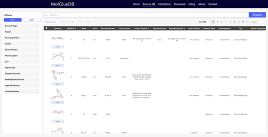 數(shù)據(jù)庫的功能模塊設計合理,支持多種檢索方式。用戶可以通過文本搜索快速查找特定MGD、靶點或E3蛋白;結構檢索功能則包括子結構搜索和相似性搜索,配備在線分子編輯器,便于用戶繪制或修改分子結構進行查詢。多維度篩選工具允許根據(jù)靶點、E3招募蛋白、理化性質(zhì)或藥效團類型過濾數(shù)據(jù),幫助研究者高效定位潛在候選物。在人工智能驅(qū)動的藥物設計中,這些功能可支持機器學習模型的訓練和虛擬篩選,加速新型MGD的發(fā)現(xiàn)。