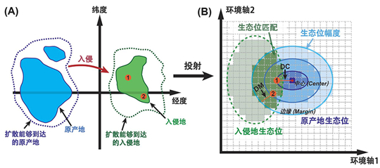 圖2. 在二維環(huán)境空間中量化多個(gè)生態(tài)位屬性的示意圖。(A)地理空間;(B)環(huán)境空間。
