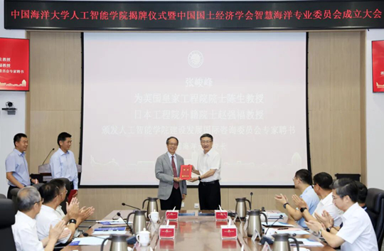 張峻峰、陳生、趙強(qiáng)福、程利偉、張占海、柳忠勤、劉軍萍、董軍宇等共同為中國(guó)海洋大學(xué)人工智能學(xué)院揭牌。