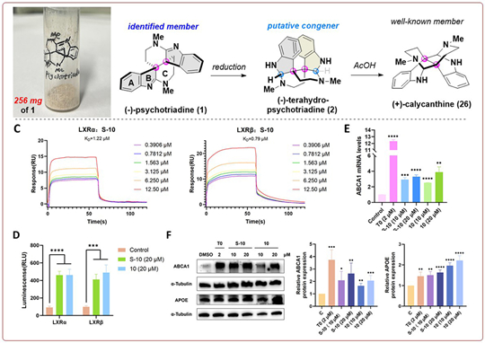 研究團隊從簡單原料色胺出發(fā),僅需12步即可高效完成256毫克天然產(chǎn)物(−)-Psychotriadine的對映選擇性全合成,通過X射線晶體學分析確定其絕對構型,為解析天然Psychotriadine的構型提供了關鍵依據(jù)。此外,研究團隊進一步通過立體選擇性還原合成了生物同源物Tetrahydropsychotriadine,證實了同系物的可及性和生源假說。由于物質本身難以獲取,導致Psychotriadine及其同系物的生物活性研究從未被涉足,研究發(fā)現(xiàn)合成中間體S-10與10能夠作為高效的肝X受體(LXRs)激動劑,顯著上調ABCA1和APOE的蛋白表達水平,展現(xiàn)出作為治療阿爾茨海默癥藥物先導化合物的良好潛力。