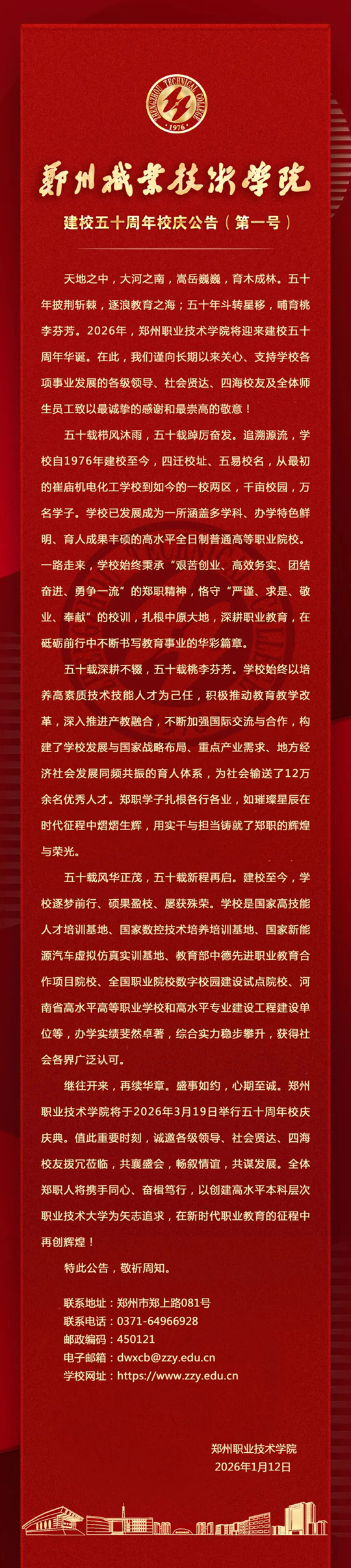 鄭州職業(yè)技術(shù)學(xué)院建校五十周年校慶公告(第一號)