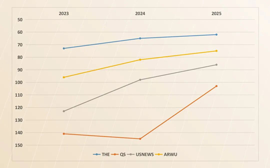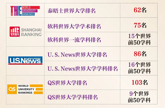 2024年,學(xué)校在泰晤士高等教育(THE)、軟科(ARWU)、U.S.News等世界三大大學(xué)排行榜中均進(jìn)入全球前100名。2025年,QS排名較上年躍升42位,列全球第103位。