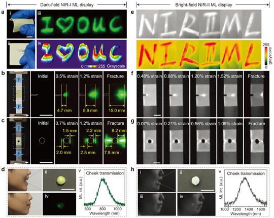 圖1. 近紅外應(yīng)力發(fā)光在暗場(chǎng)和明場(chǎng)環(huán)境下的應(yīng)力分布可視化和生物力學(xué)成像實(shí)驗(yàn)展示