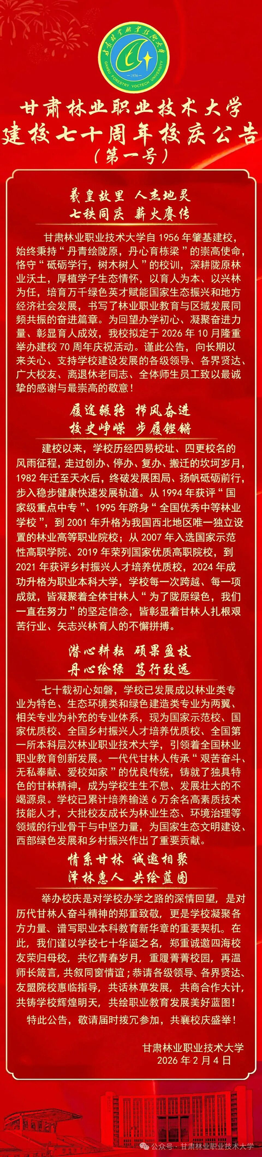 甘肅林業(yè)職業(yè)技術(shù)大學(xué)建校七十周年校慶公告(第一號(hào))