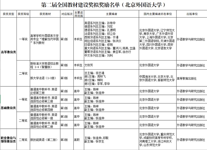 | 北京外國(guó)語(yǔ)大學(xué)多部教材獲評(píng)第二屆全國(guó)教材建設(shè)獎(jiǎng)及國(guó)家級(jí)規(guī)劃教材 |