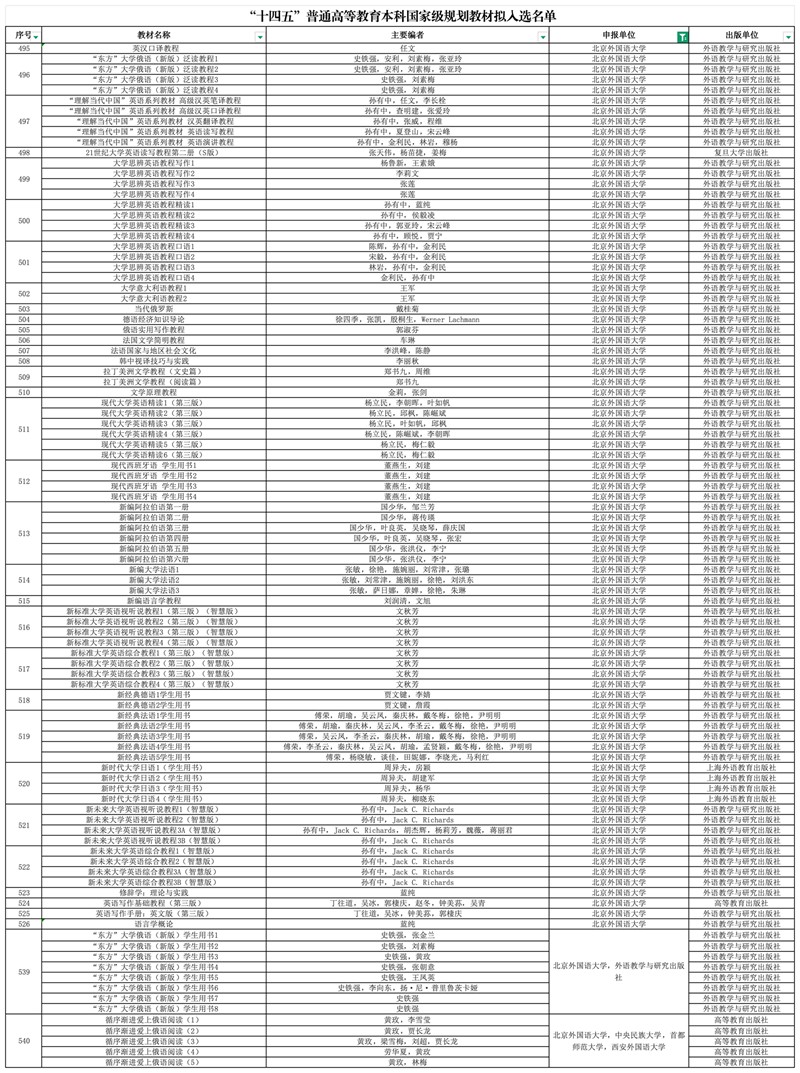 近日,教育部公布了《關(guān)于第二屆全國(guó)教材建設(shè)獎(jiǎng)勵(lì)名單的公示》《關(guān)于“十四五”普通高等教育本科國(guó)家級(jí)規(guī)劃教材擬入選名單的公示》和《關(guān)于公布第二批“十四五”職業(yè)教育國(guó)家規(guī)劃教材書(shū)目的公告》,多部北京外國(guó)語(yǔ)大學(xué)教師主編參編教材獲獎(jiǎng)。