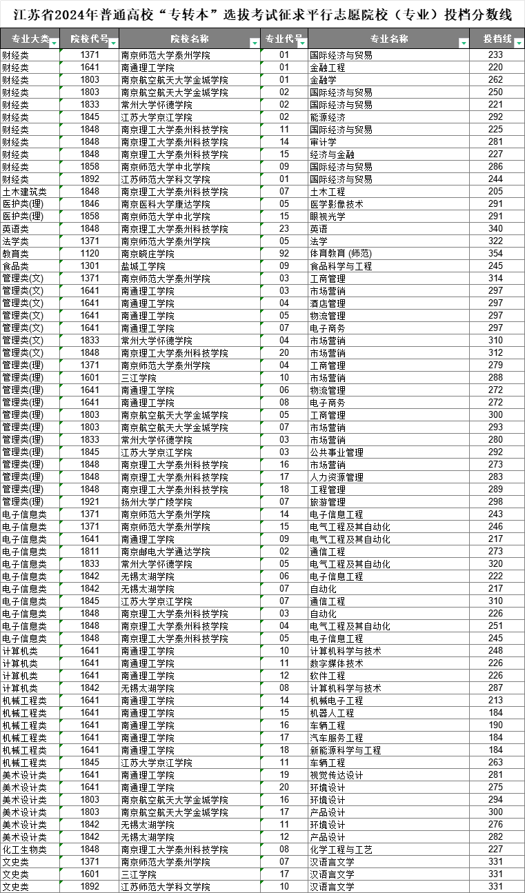 江蘇省2024年普通高校“專轉(zhuǎn)本”選拔考試征求平行志愿院校(專業(yè))投檔分?jǐn)?shù)線