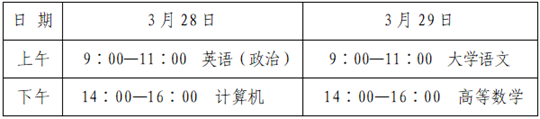 統(tǒng)考科目為4門公共基礎課,包括英語(專科期間公共外語課程為非英語的考政治)、計算機、大學語文、高等數(shù)學(分為高等數(shù)學Ⅰ、高等數(shù)學Ⅱ、高等數(shù)學Ⅲ),具體考試科目設置情況見附件4。每門科目考試時間120分鐘、滿分100分,總分滿分400分。省教育招生考試院負責統(tǒng)一命題,統(tǒng)一考試,統(tǒng)一評卷。各科考試時間安排如下: