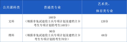填報非免試退役士兵專項(xiàng)計劃和建檔立卡考生專項(xiàng)計劃中藝術(shù)類、體育類專業(yè)的考生,其公共課合格線按照低線執(zhí)行(即文科120分,理科68分)。