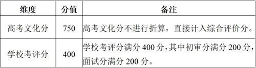 綜合評(píng)價(jià)分滿分為1150分,具體計(jì)算方法為:綜合評(píng)價(jià)分=高考文化分+學(xué)?荚u(píng)分。