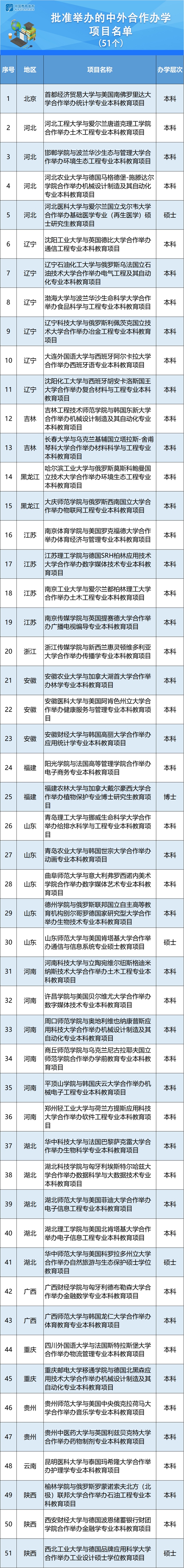 | 教育部批準(zhǔn)的2020年下半年51個(gè)中外合作辦學(xué)項(xiàng)目名單 |