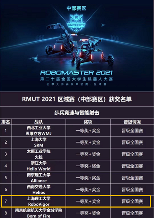 | 上海理工大學(xué)中英國際學(xué)院RoboVigor機(jī)器人隊(duì)獲RoboMaster 2021中部區(qū)域賽RMUT高校單項(xiàng)賽一等獎并晉級全國總決賽 |