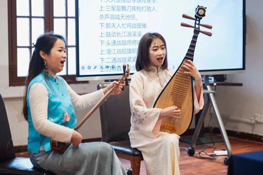 最后,在互動(dòng)環(huán)節(jié),兩位嘉賓選取了一些評(píng)彈演奏中的常用語,如“你”“我”“他”等,逐字逐句地教大家發(fā)音,現(xiàn)場(chǎng)黨員積極跟隨學(xué)習(xí),氣氛十分熱烈。她們帶領(lǐng)現(xiàn)場(chǎng)黨員學(xué)唱評(píng)彈《鶯鶯拜月》的片段和蘊(yùn)含江南韻味的歌曲《聲聲慢》,吳儂軟語搭配清雅的三弦、琵琶伴奏,展現(xiàn)了傳統(tǒng)樂曲的韻味,活動(dòng)在《聲聲慢》的動(dòng)人合唱中結(jié)束。