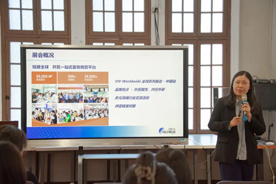 萬耀企龍人力資源總監(jiān)張若旻首先以公司發(fā)展歷程為切入點,詳細介紹了萬耀企龍的四類核心展會活動,如亞寵展、米蘭國際家具展以及VIV國際畜牧展等。她還介紹了公司全球化戰(zhàn)略及人才培養(yǎng)體系,重點推介了面向商科學生的市場策劃、項目運營等崗位的招聘計劃以及福利待遇。她表示,公司尤為重視員工的創(chuàng)新能力和實踐精神,鼓勵同學們在實習中積累經驗、展現潛力。