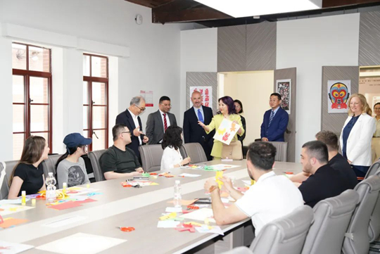 利物浦約翰摩爾大學(xué)國際部主任、利物浦中國合作組織副主席王懿博士,工程學(xué)院院長克里斯蒂安·馬修(Christian Matthews)博士,工程技術(shù)學(xué)部外事副主任羅賓·派恩(Robyn Pyne)博士,在中英國際學(xué)院班子成員的陪同下參觀復(fù)興路校區(qū)校史館,與正在體驗(yàn)中國剪紙的、參加學(xué)院2025年國際夏校的利物浦約翰摩爾大學(xué)學(xué)生交流。