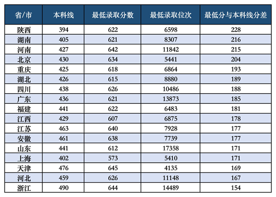 所有招生省市的錄取分?jǐn)?shù)線均超過(guò)對(duì)應(yīng)省市本科批次錄取線150分以上,平均分差為186分,達(dá)到歷年最高水平;在17個(gè)省市的最低錄取分?jǐn)?shù)與學(xué)校普通批(物理類(lèi))最低錄取分?jǐn)?shù)差額均值為23分,較2024年縮小2分,達(dá)到歷年最高水平。