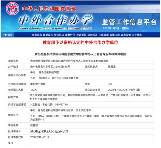 近日,教育部公布中外合作辦學(xué)項目審批結(jié)果,青島恒星科技學(xué)院與韓國京畿大學(xué)合作舉辦的人工智能專業(yè)本科教育項目成功獲批。這是青島恒星科技學(xué)院首個獲教育部批準的中外合作辦學(xué)項目,標志著學(xué)校在引進優(yōu)質(zhì)國際教育資源、推進人才培養(yǎng)國際化方面邁出了重要一步。
